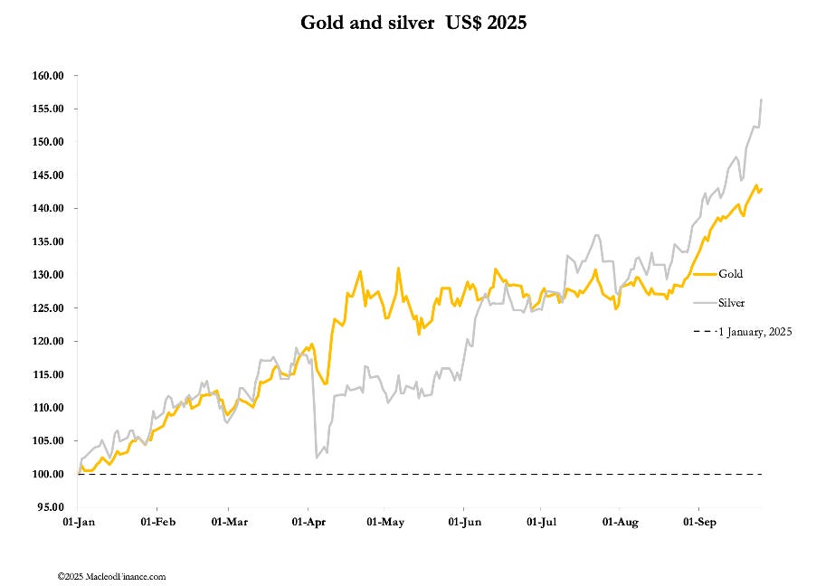 Our headline chart shows silver storming ahead amid reports of backwardations and soaring lease rates. Will it continue, and will gold be next?