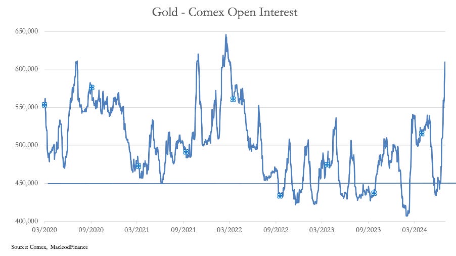 It has soared in the last fortnight. Interestingly, despite yesterday being a down day, on preliminary estimates, Open Interest rose by 17,110 contracts when it would have been expected to fall as open long positions were liquidated. One can only conclude that the bullion banks took out additional bear positions to deliberately trigger hedge fund stops.