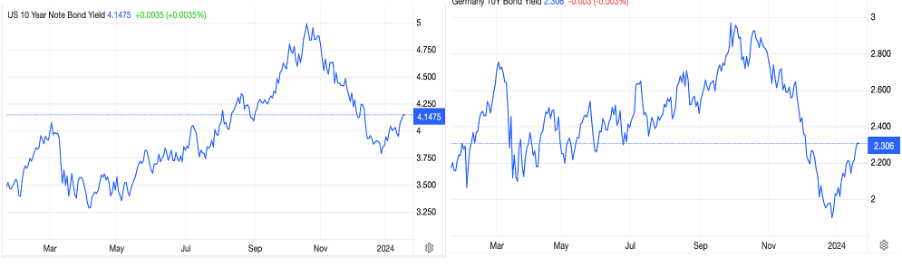 The macro story is one of growing doubts that the Fed will cut interest rates as soon as currently discounted, not helped by the closure of the Red Sea to marine traffic. Economists warn of inventory shortages and supply chain disruption likely to put upward pressure on consumer prices. Accordingly, the yields on the 10-year US Treasury Note and the 10-year German Bund have increased sharply so far this month. These are our next charts.