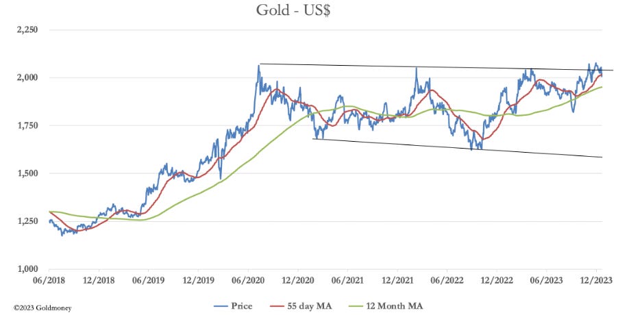 Following last week’s brief rally, gold and silver declined this week. In Europe this morning, gold traded at $2029, down $19 from last Friday’s close. And silver was $22.80, down 28 cents over the same timescale. Comex volumes were moderate though declining as the week progressed, indicating that selling pressure is moderating.