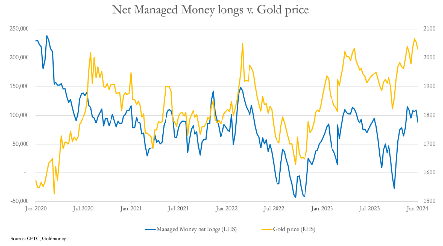 Indeed, there is an air of general disinterest in gold and silver, not helped by the Martin Luther King holiday on Monday. In gold, Comex Open Interest declined by over 23,000 contracts. Undoubtedly, this represents a modest reduction in hedge fund net longs from 9 January, the most recent Commitment of Traders report. This is our next chart.