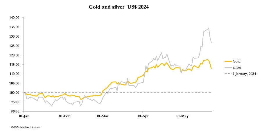 Gold and silver corrected sharply this week, with gold down $85 from last Friday’s close at $2342 in European trade this morning. And silver was off $1.30 at $30.56 over the same time period. While nominally these appear to be large numbers, in percentage terms and given their recent rises these corrections should be regarded as to be expected.
