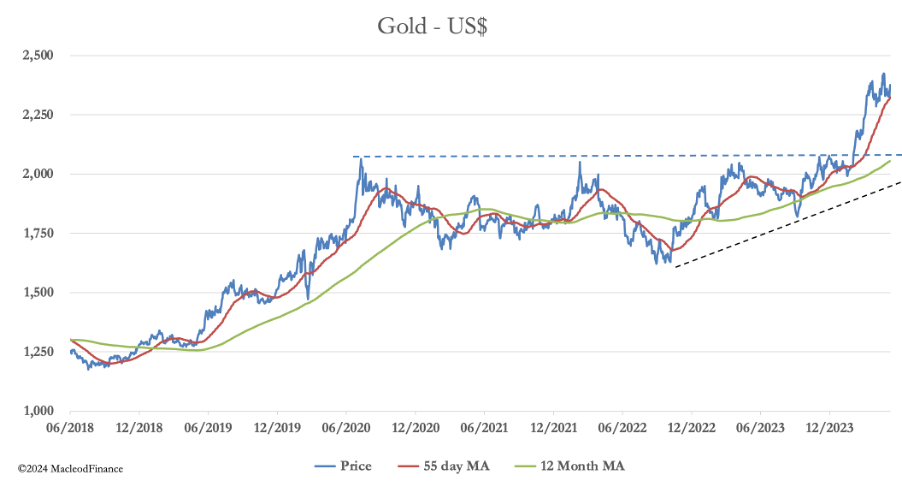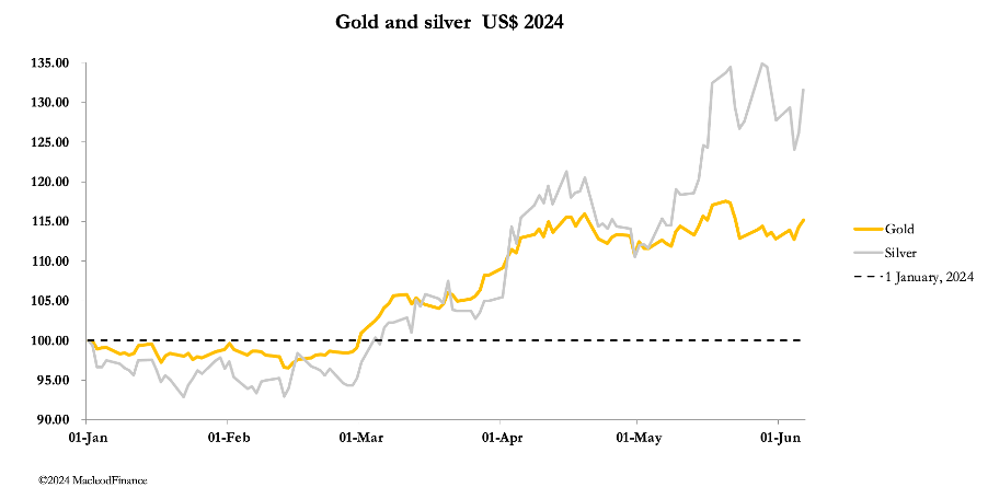 This week has seen underlying firmness in gold and silver markets, with gold trading at $2351 in European trade this morning, up $25, and silver at $30.82, up 45 cents. Silver was especially volatile, falling sharply mid-week before rallying over 4% yesterday. Being Friday and China off for the weekend, the shorts are taking the opportunity to unwind some of yesterday’s rise.