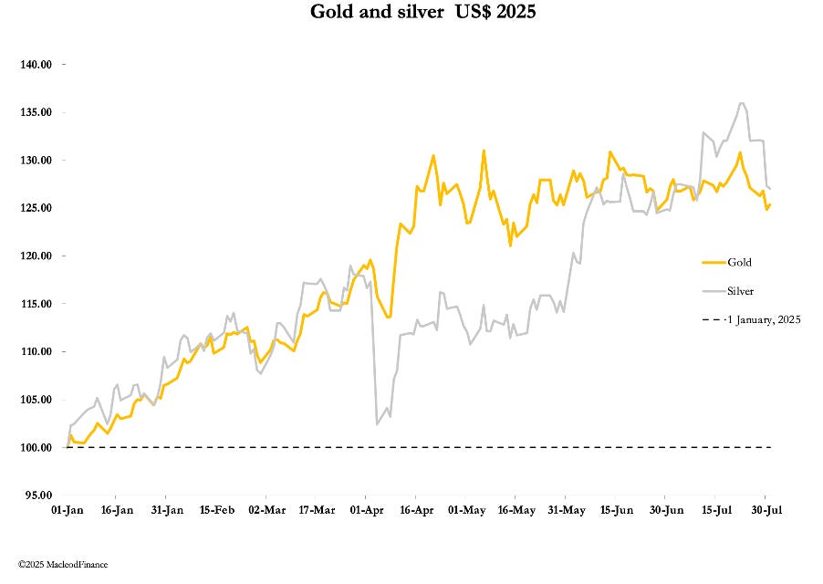 With Comex’s August contract running off the board and copper’s collapse it is hardly surprising that precious metals traded lower this week. In European trade this morning, gold was $3294, down $43 from Friday’s close, and silver at $36.48 down $1.65. The gold/silver ratio has returned to 90.