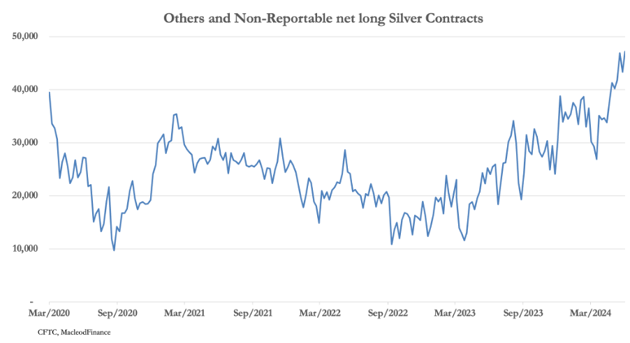 The COT figures for last Tuesday showed that the Swaps’ (mainly bullion bank trading desks) net short position had deteriorated by 846 contracts. And the Managed Money category had reduced its net long exposure by 3,424 contracts. But these reductions had fed mostly into the Other and Non-Reportable categories, which rose to a combined record net long 47,189 contracts. The chart is below: