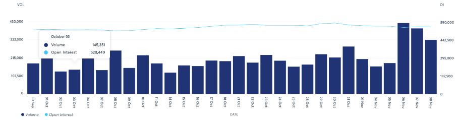 As the thin blue line in the chart above shows, the big fall in the gold price on 6 November doesn’t seem to have rattled the bulls, with Open Interest subsequently declining a little over 5,000 contracts from Tuesday (the last Commitment of Traders figures). I would say, however, that gold selloffs on unexpected news can go deeper than this one, as the post-Lehman experience showed.