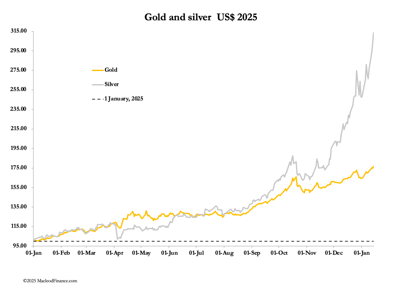 This week, gold gently marched higher while silver continued its moonshot. In mid-morning European trading, gold at $4606 was up $100 from last Friday’s close, while silver at $90.75 was up $10.85.