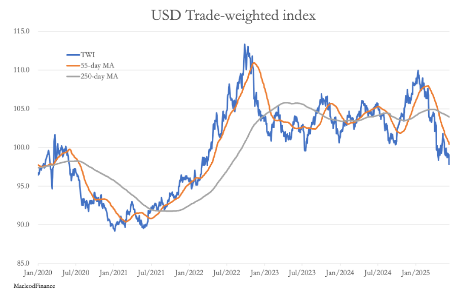 According to US Treasury TIC figures for March, foreign ownership of dollars and underlying financial assets total $39.6 trillion. That is a measure of selling pressure, and it’s even causing officials at the ECB to speculate that the dollar’s misfortune could lead to a greater international role for the euro. Maybe, but it seems almost certain that risk-off for the dollar is risk-off for all fiat currencies, benefiting currency exchange rates with real money without counterparty risk, which is gold.