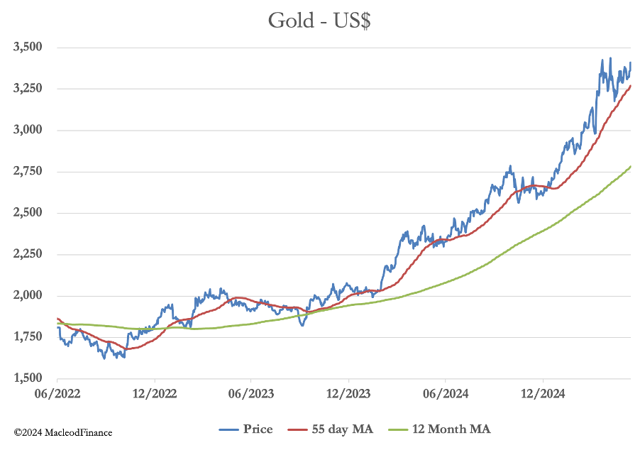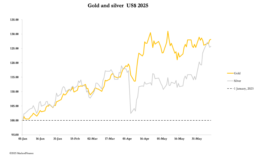 The next chart shows gold’s technical position. It has been consolidating its record-breaking rise to mid-April, but now looks ready to challenge the $3500 level seen briefly on 22 April: