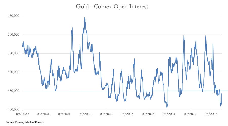 This could be the wake-up call for US hedge funds to buy gold futures, the oversold position being due to their non-participation so far in gold’s recent strength. This contract’s open interest has the potential to expand by 150,000—200,000, which would drive gold considerably higher and cause serious pain for the shorts.