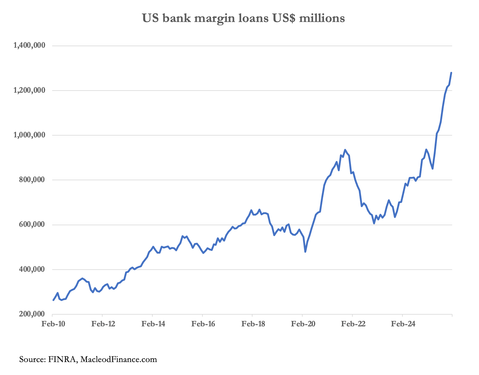 For bank margin loans, read credit fuelling equity markets. The chart above shows where the expansion of bank credit is going. Furthermore, this is just the retail stuff deployed through brokers, because hedge funds and other institutional traders including those running banks’ trading books go direct to the banks.