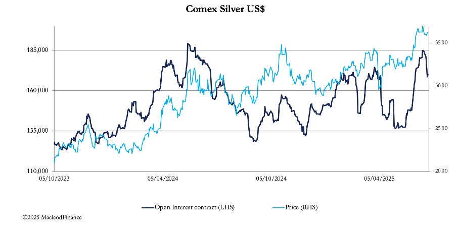 This week, silver has been notably firm despite Comex open interest declining, shown in the chart below: