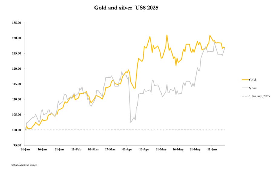 Another week of universal apathy. It is the end of the first half of 2025 with book squaring in mind, and the July futures contract running off the board. In Europe this morning, gold was $3285, down $93 on the week, and silver at $35.85 down 20 cents. Interestingly, price weakness featured during Hong Kong and Shanghai trading hours particularly for gold, a pattern which has been noticeable recently.