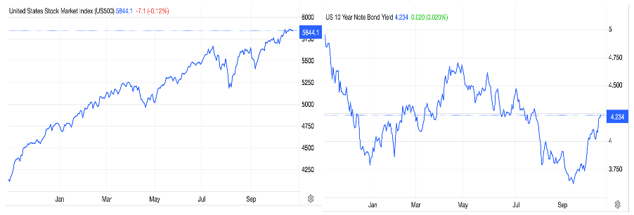There is a growing air of surrealism in markets. The S&P500 is close to all-time highs, yet yields on US treasuries are rising, with the 10-year note yield having risen from 3.62% on 16 September to 4.234% today and the long bond to 4.52%. And this is despite expectations of lower interest rates over the next few months.