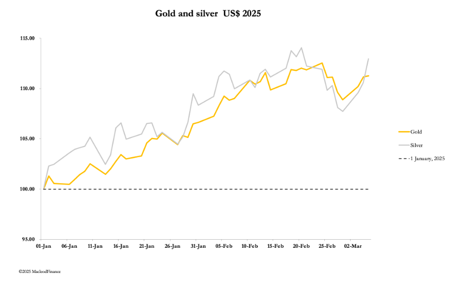 This week, the end-February decline in gold and silver prices appear to be over, with a recovery based on a firm undertone. In early European trading this morning, gold was $2,920, up $60 from last Friday’s close, and silver $32.60, up $1.50.