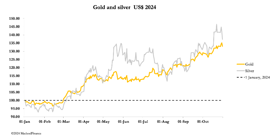 Gold hit a new record high this week, while silver failed to challenge its recent high of $34.80 on 22 October before prices declined on profit taking. In European trade this morning, gold was $2751, up $65from last Friday, and silver $32.80, down 90 cents on the same timescale. Comex volumes in gold were high, while in silver only slightly less so.