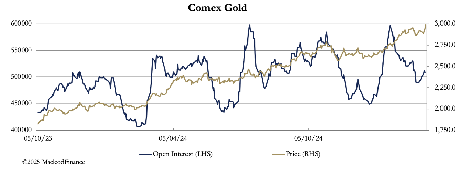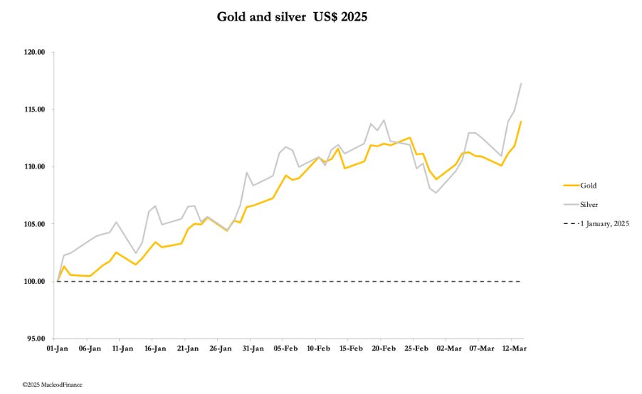 Gold and silver rose strongly this week, with gold going into new high ground, while silver, which has underperformed gold recently is catching up rapidly. In European morning trade, gold was $2999, up $90. And silver at $33.98 rose $1.48. That makes gold up 14% so far this year, while silver is up 18% — strong performances in sharp contrast relative to other asset classes which are sliding into bear markets.