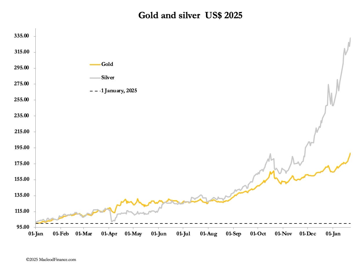 Gold and silver continued to rise this week, both establishing new record prices in all currencies. In early morning European trade, gold closed out the week at $4915, up $308, and silver at $98.20 is up $8.10. Overnight, they hit $4967 and $99.30 respectively.