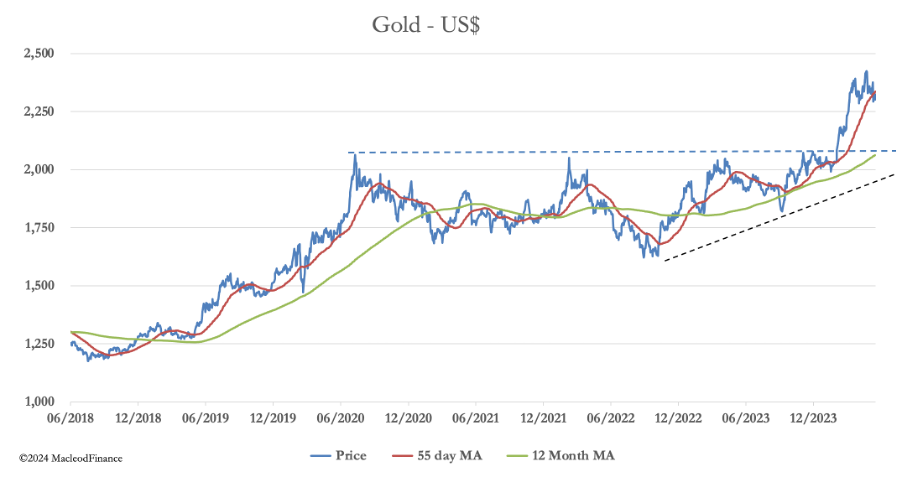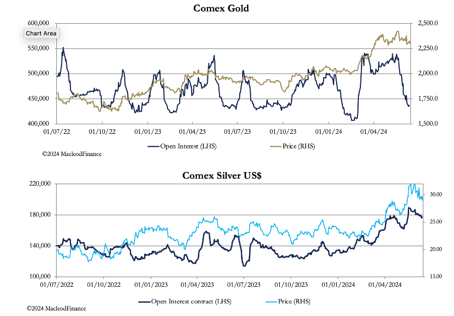 Increasing paper interest in silver, reflected in both Comex volumes and Open Interest are therefore to be expected, as are bouts of profit taking from time to time. The position in gold is fundamentally different, with Comex Open Interest falling while prices rise or at least remaining firm. They reflect an extraordinary divergence between market sentiment and prices.