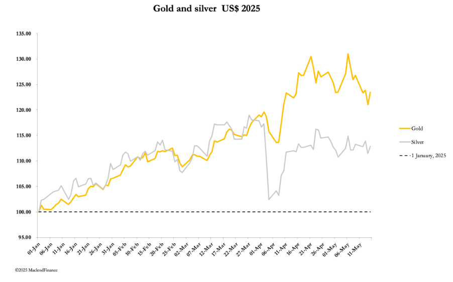 As proof that western capital markets no longer determine gold and silver prices, declines this week have been during Far East trading hours. While trading on the Globex facility by Westerners cannot be ruled out, the fact that moves happen during Shanghai trading hours should be noted. And while SGE physical deliveries have increased (153.05 tonnes in April v. 120.16 in March) it would appear that leveraged futures in Shanghai are causing some market indigestion.