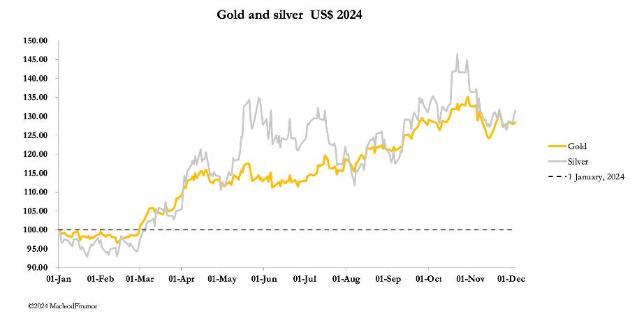 Gold consolidated in a narrow trading range this week, while silver gained some ground. In early morning European trade, gold was $2642, $3 up on balance from last Friday’s close, and silver was $31.30, up 81 cents on the same timescale. Comex futures trading was light, as the following screenshots show for gold and silver respectively: