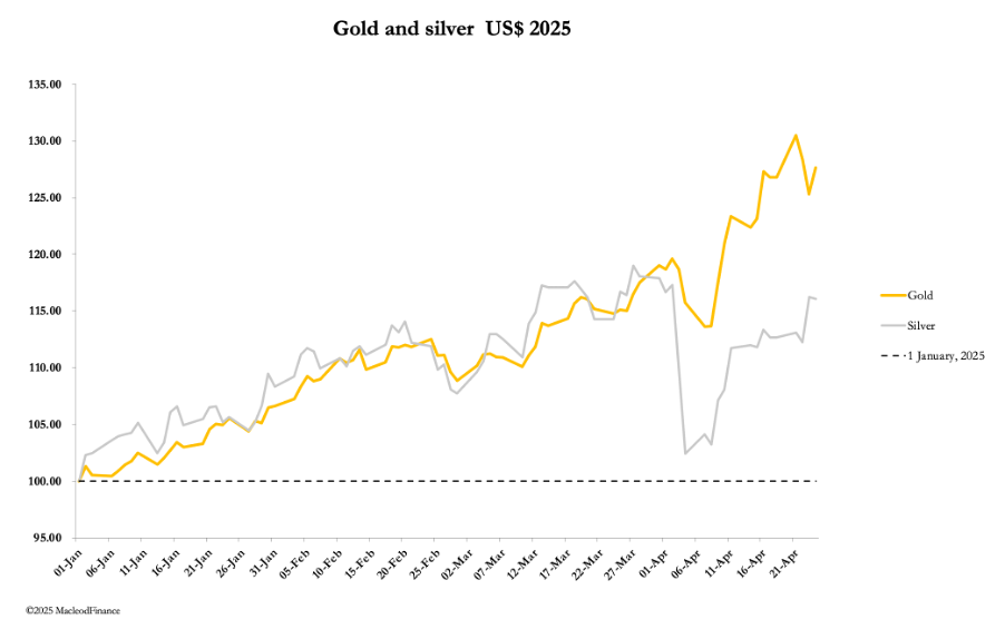 After gold’s dramatic run to $3500 on Tuesday, gold has backed off on profit-taking. This morning in European trade gold was $3300, down a net $25 from last Friday’s close and up 27% this year so far. Silver was $33.35, up 85 cents from last Friday and up 15% this year so far.