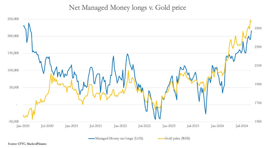The last data point for the net long position for hedge funds was 17 September (COT report) due to be updated on Friday. Since then, open interest has increased by 28,256 contracts on preliminary figures for yesterday (Tuesday). That implies that this category of trader (managed money) is net long of about 240,000 contracts and therefore highly vulnerable to a bear raid by the swaps (bullion bank traders and market makers). And note how the rise in their net position is in lockstep with the price. But there is other evidence which we cannot ignore and is a new factor in the market.