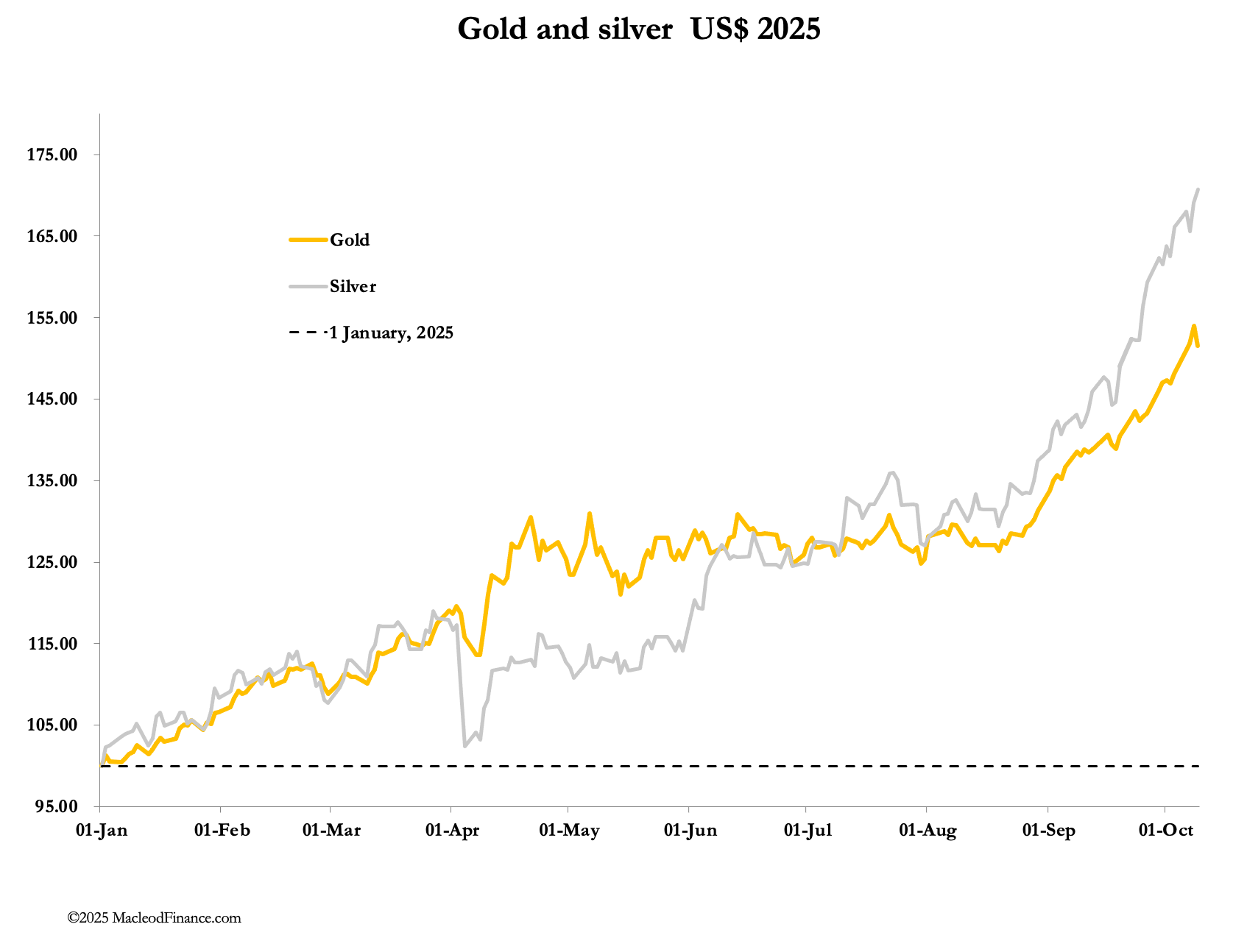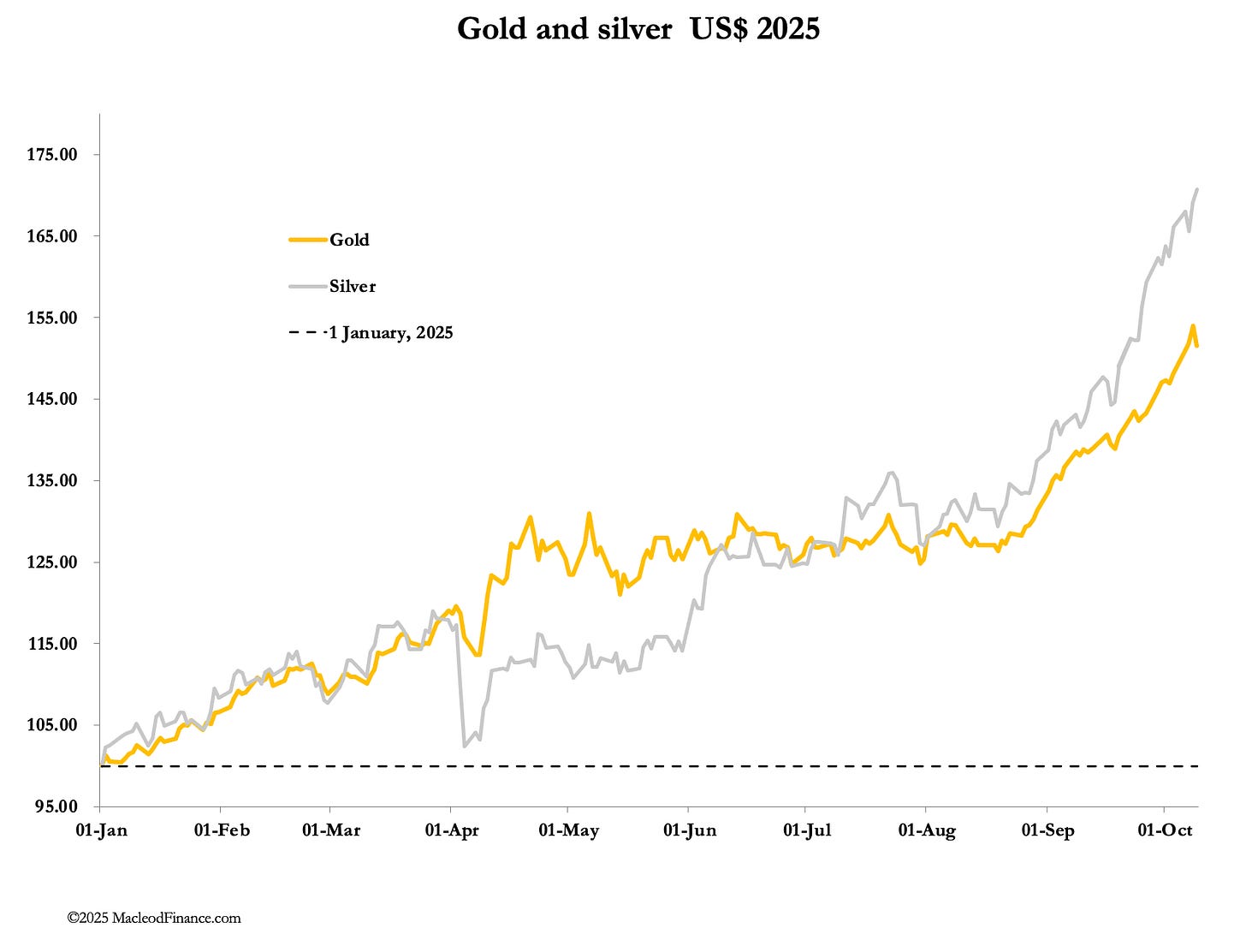 In European trade this morning, gold was $3994, up $110 from last Friday’s close. And at $50.90, silver rose $3.00 over the same time scale. Physical liquidity in silver is particularly short, with lease rates reportedly at 19% at one stage, reflecting none being available to cover forward contract deliveries in London.
