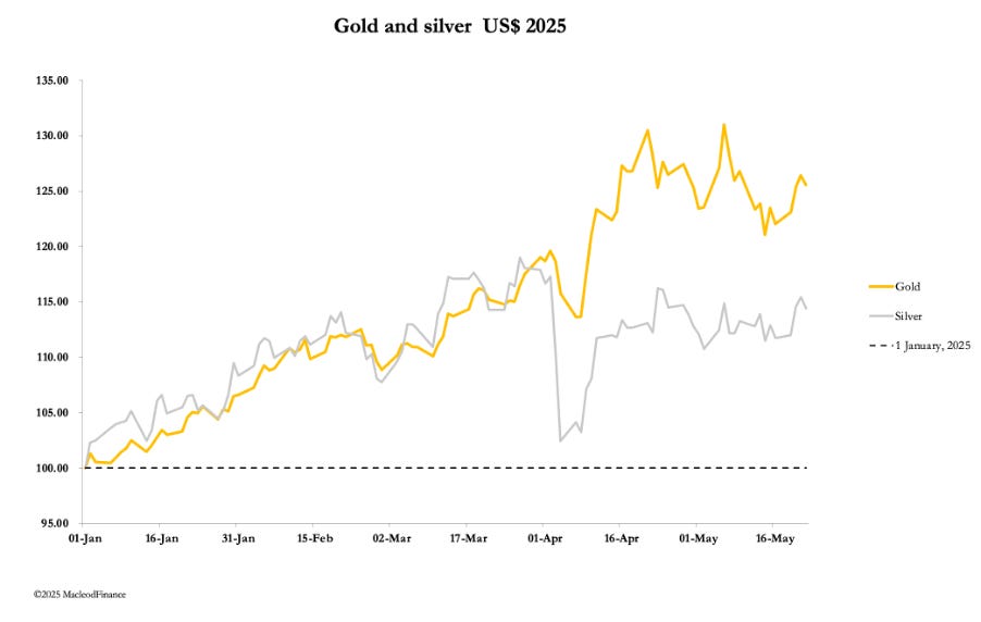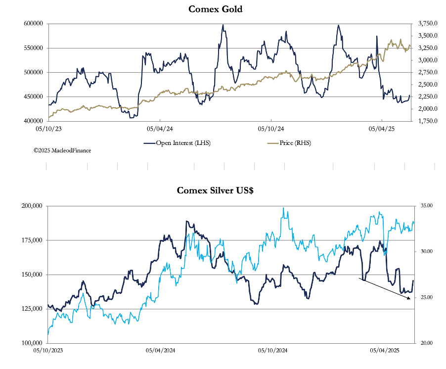 This week saw moderately firmer prices for gold and silver following a near-four-week consolidation. In European trade this morning, gold was $3328, up $27 from last Friday’s close. And silver was $33.20, up 93 cents. Futures volumes on Comex remained low-to-moderate, though picking up slightly as the week progressed.