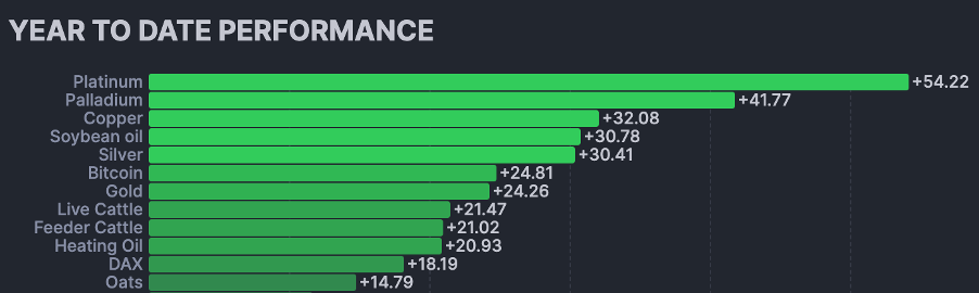 There is an emphasis on precious metals and bitcoin, which are regarded as inflation hedges pointing the way to other commodity prices rising as well. WTI crude has been a saving grace so far, but after a sharp selloff in April even that has rallied by 8%.