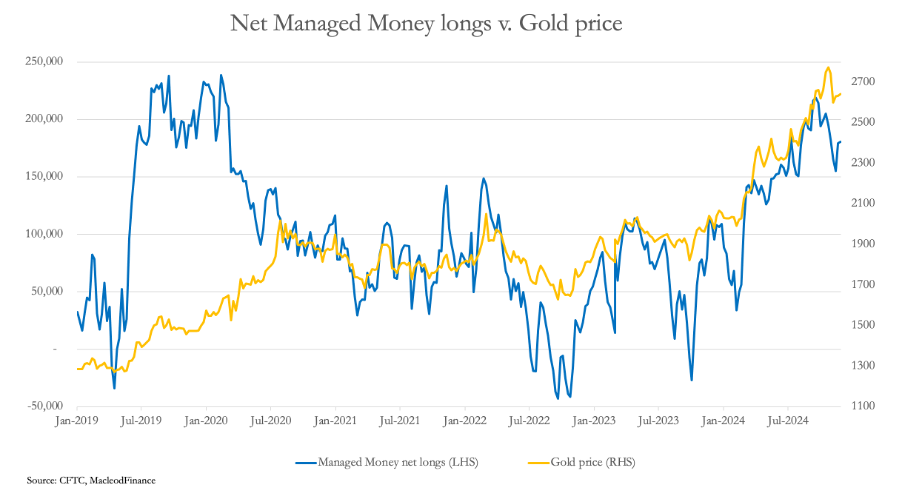 The chart below shows how Comex’s Managed Money category drives the gold price, and has been doing so, particularly since 2021: