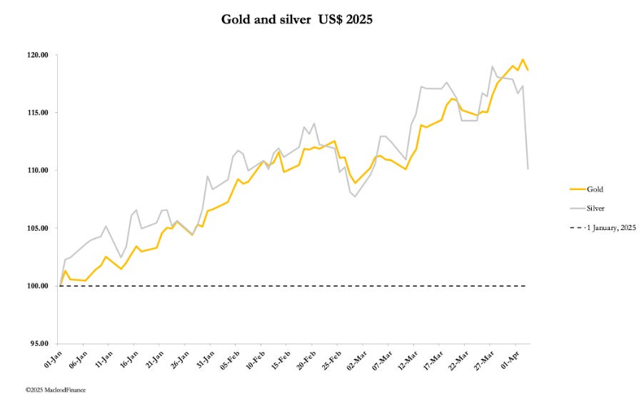 Due to indiscriminate asset liquidation to pay for mounting losses in equities, gold and silver values fell this week. In European trade this morning, gold was $3095, down $27 from last Friday’s close, but silver was very hard hit at $31.34, down a whopping $2.76. Most of the damage happened yesterday (Thursday) in the wake of Trump’s tariff announcement the previous afternoon.