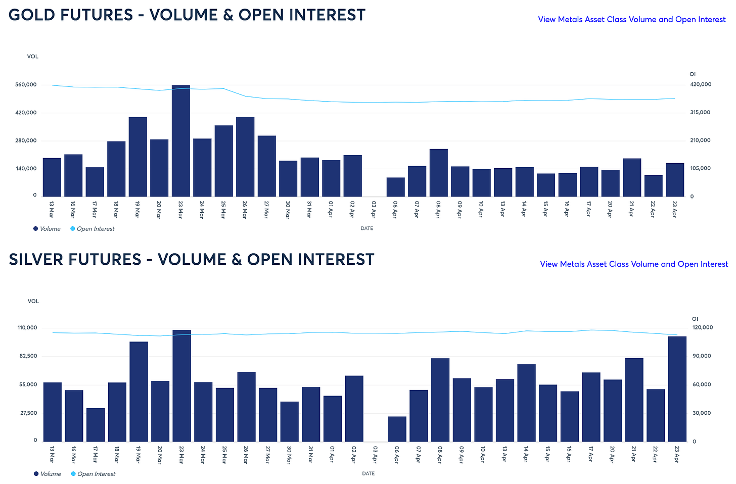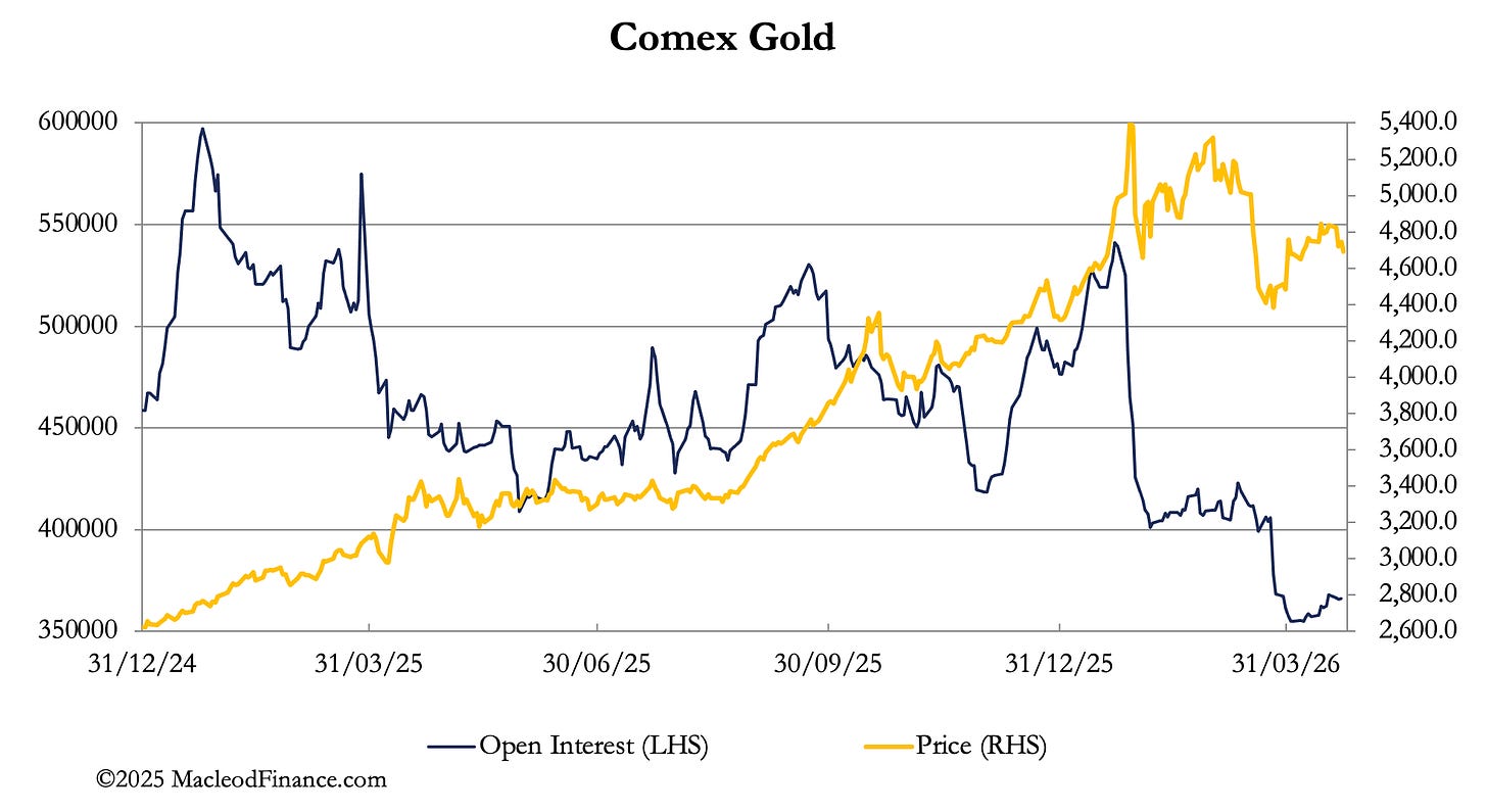 This morning in Europe gold was $4690, down $145 from last Friday’s close and silver at $74.85 was down $5.90. Comex volumes for this month in gold have been very low, while there was better volume in silver. This contrast is illustrated below: