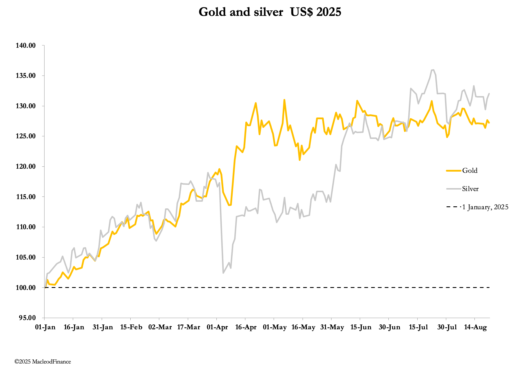 A notable feature in these otherwise unremarkable conditions has been stand for deliveries on Comex. Since the end of July, a whopping 102.8 tonnes of gold have been stood for delivery, taking the total so far this year to 873.6 tonnes. In silver, over the same periods, 267.5 tonnes and 8,665 tonnes have stood for delivery respectively.