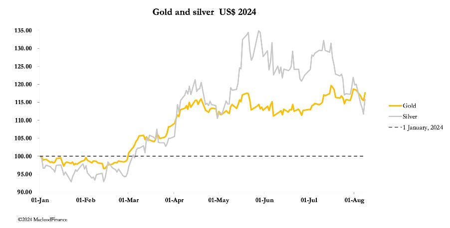This week, gold consolidated, showing remarkable price resilience, while silver less so. In early European trading this morning, spot gold was $2425, down $17 from last Friday’s close, while silver was $27.52, down a dollar on the same time scale. Aside from Thursday morning, there was little evidence of overnight gold demand from Asia ahead of London’s morning fix, suggesting that market turmoil in equities is having a deterrent effect on Chinese speculators.