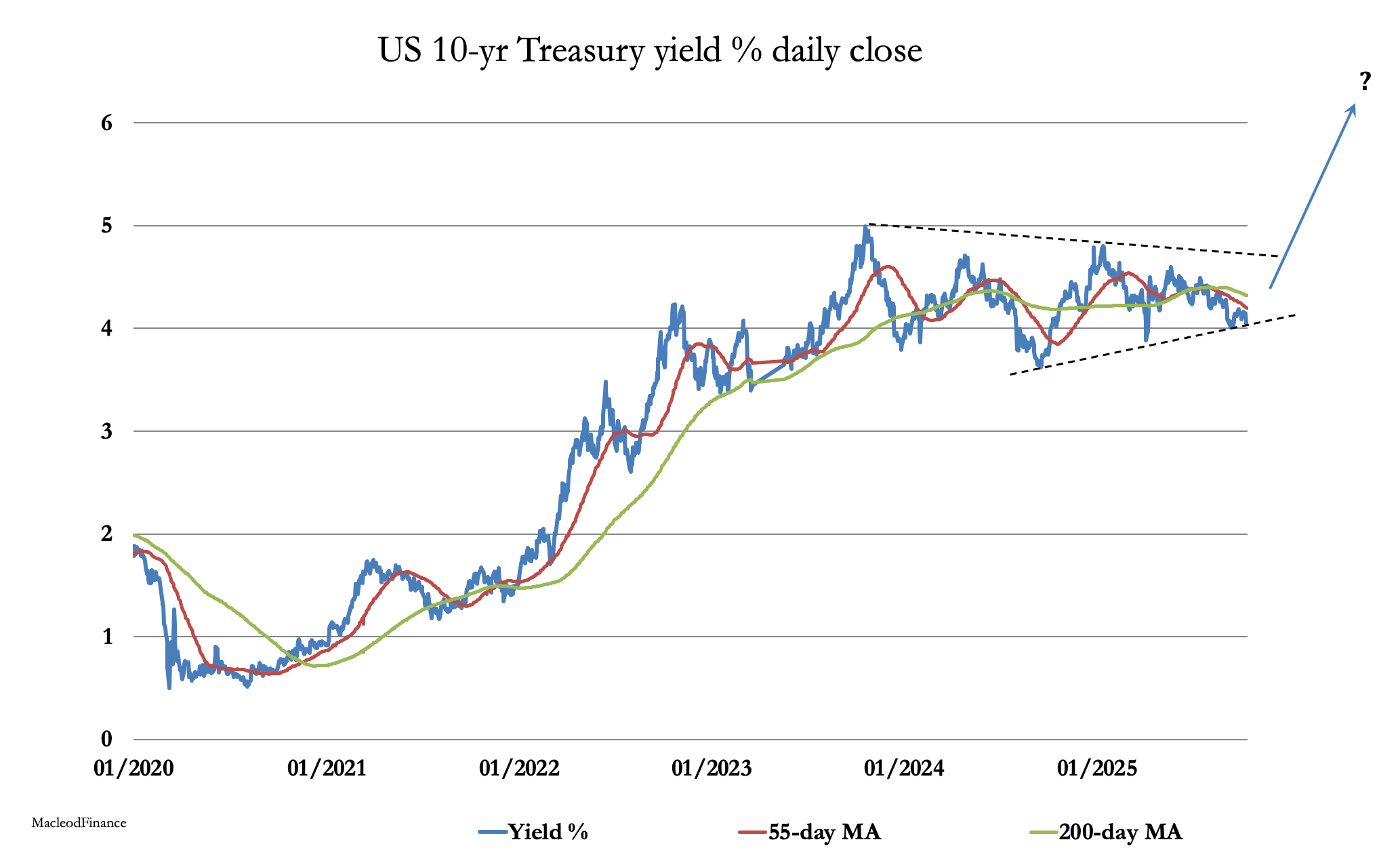 Standing back from post-covid economic and financial developments, we see that the rise in yields to late-2023 broke a strong, long-term downtrend, which tends to confirm the hypothesis that there are more bond yield rises to come: