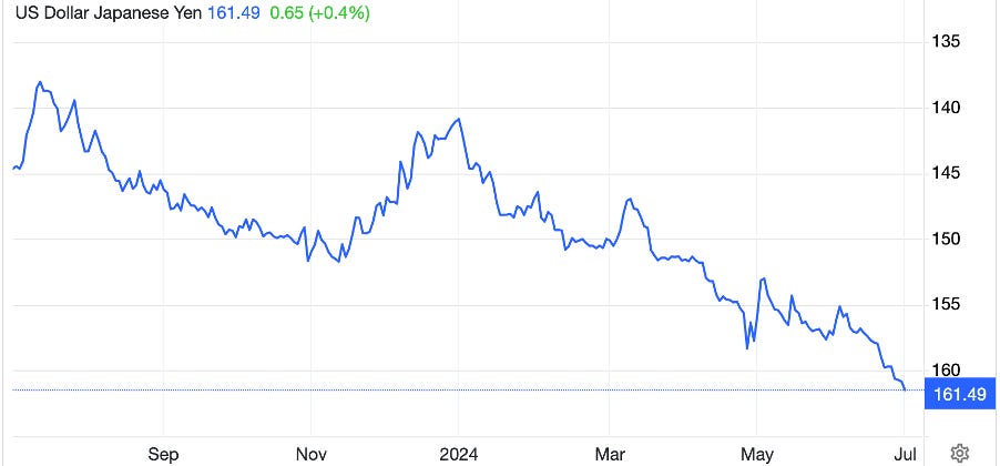 On Thursday, we have the UK’s general election. We’ve had the first round of the French, which has many commentators talking of insurrection. And President Biden’s tangential relationship with reality is truly pitiful. But then politics is a cruel game. Meanwhile, the yen is collapsing through JPY161.