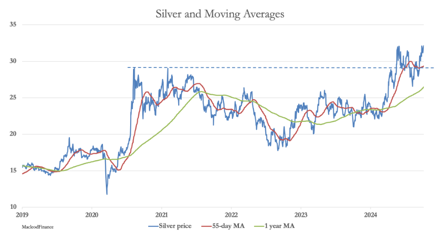 I start this note with silver’s technical chart, which any technical analyst will agree is very bullish, particularly since silver is challenging new high ground in this particular timescale. It has been higher in the past, notably 2011—2012, when it peaked at $49.80 and the situation was nothing like that of today. We can therefore confidently assume that past levels don’t matter, and for all intents silver is marching into new high ground.