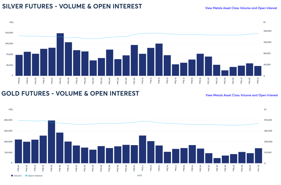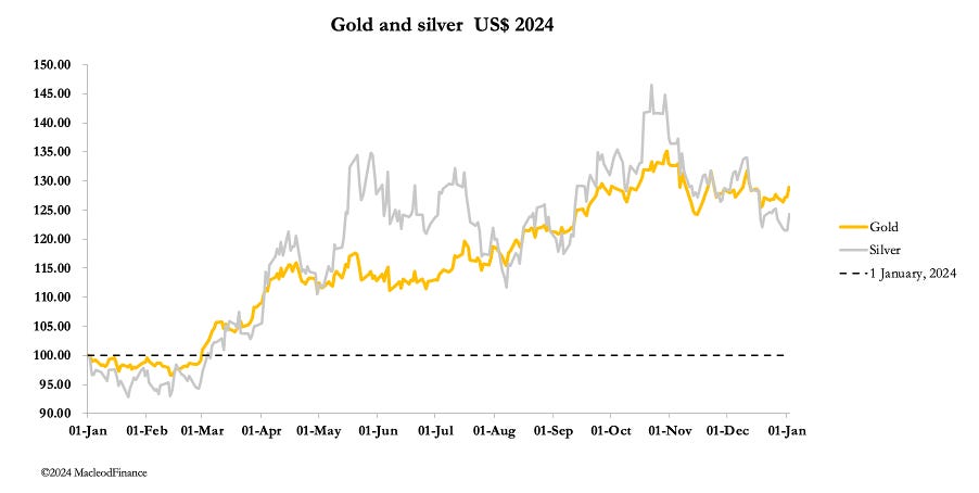 Gold and silver ended 2024 consolidating earlier gains. But the first few days of trading in 2025 were positive. In European trading today, gold was $2658, up $37 from last Friday’s close after testing $2600. Silver was $29.75, up 40 cents on balance. Trading has been seasonally light as shown by Comex volumes.