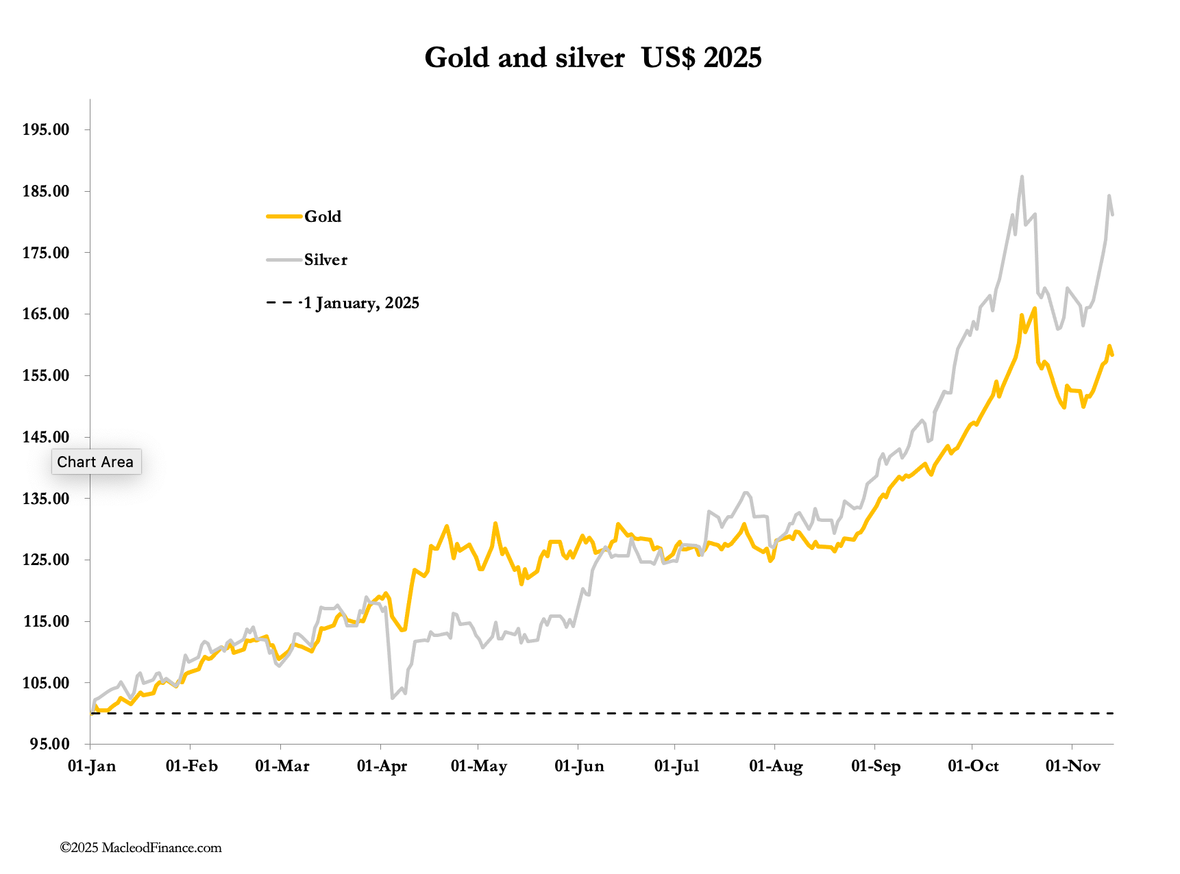 The resilience of precious metal prices was demonstrated this week as both gold and silver rose towards new high ground. In European trading this morning, gold was $4170, up $169 from last Friday’s close. And silver at $52.75 was up $4.45 on the same time frame having touched its mid-October all-time high of $54.35 on Wednesday.
