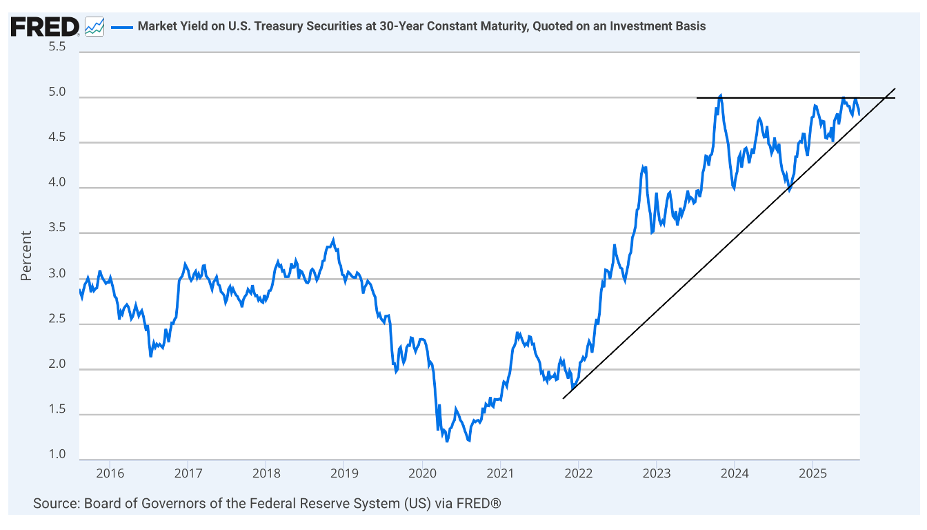 The yield on the long bond is ready to break out on the upside over 5%, giving a technical target above 9%. Implications for all financial markets are dire.