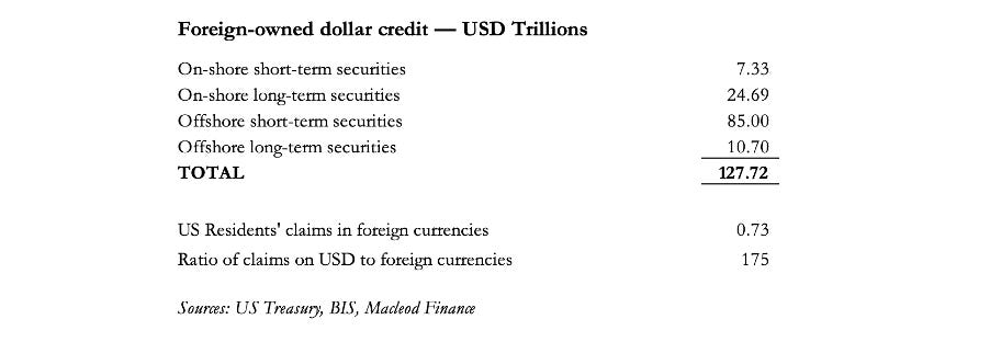 Now that the financial bubble inflated by zero and negative interest rates is being lanced, these balances are bound to diminish. We can see why this is the case just with onshore long-term securities, comprised of bonds and equities, to which we must add the estimated $10.7 trillion of eurodollar long term bonds. That’s $35 trillion in foreign-owned long-term investments in bonds and equities overhanging US financial markets, whose values are at risk from higher bond yields. Including additional offshore short-term deposits and foreign exchange positions in dollars, the total of $127.7 trillion is 175 times the foreign currencies held by US residents, available to absorb foreign dollar liquidation. This imbalance between foreign ownership of dollars and the availability of foreign currencies in US hands to absorb foreign dollar liquidation is simply staggering in its potential impact on the dollar.