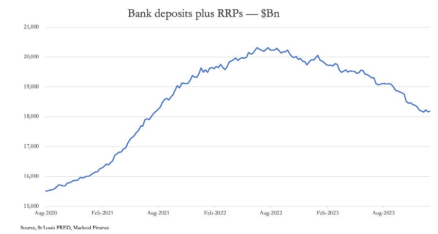 Between 2020 and late-2022, the increase in reverse repos served to conceal a far higher rate of growth in bank credit. In the belief that the crisis was temporary and having little option anyway, banks extended enormous quantities of credit; larger than unadjusted bank deposit statistics indicated on their own.