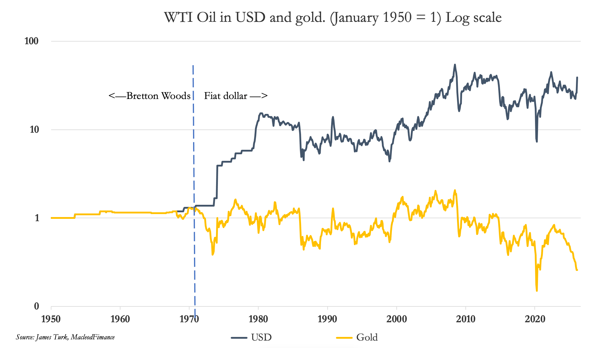 At only 26% of its 1950 post-war value, in real terms oil is remarkably cheap. Oil was only cheaper during Covid, when storage facilities ran out while speculative longs on Comex paid to avoid taking delivery. Meanwhile in dollars, the price of a barrel has risen 38 times.