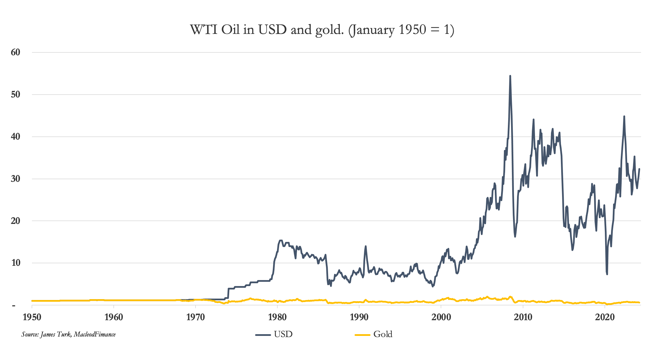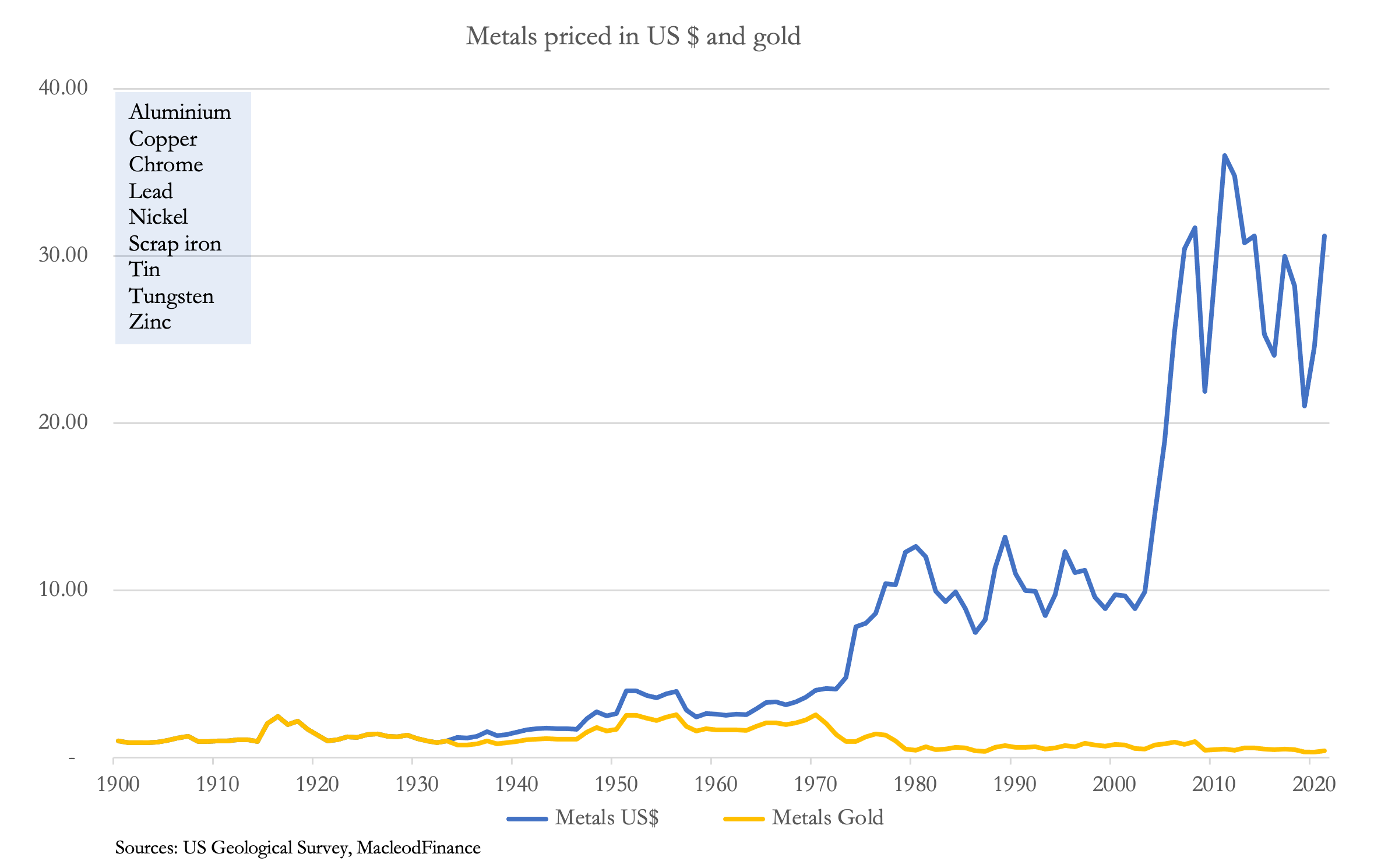 The relationship between dollars and gold has been a conundrum for many since the suspension of the Bretton Woods Agreement in 1971. The western financial establishment has lost all compass as to which is money and which is credit, with most actors not even aware of gold’s central importance. To illustrate this importance the chart below shows average values for a range of industrial metals priced in dollars and gold, followed by a chart of oil similarly priced.