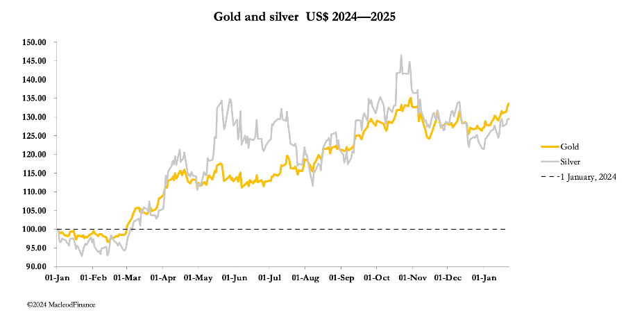 For the last two weeks before and after President Trump’s inauguration on 20 January, gold has recovered to almost new highs in dollars. In European trade this morning, gold was trading at $2774, up $73 on the week and silver was $30.85, up 53 cents for a gold/silver ratio of nearly 90 times. Comex volumes were generally healthy, with the exception of high volumes on Tuesday following Monday’s closure for Inauguration Day.