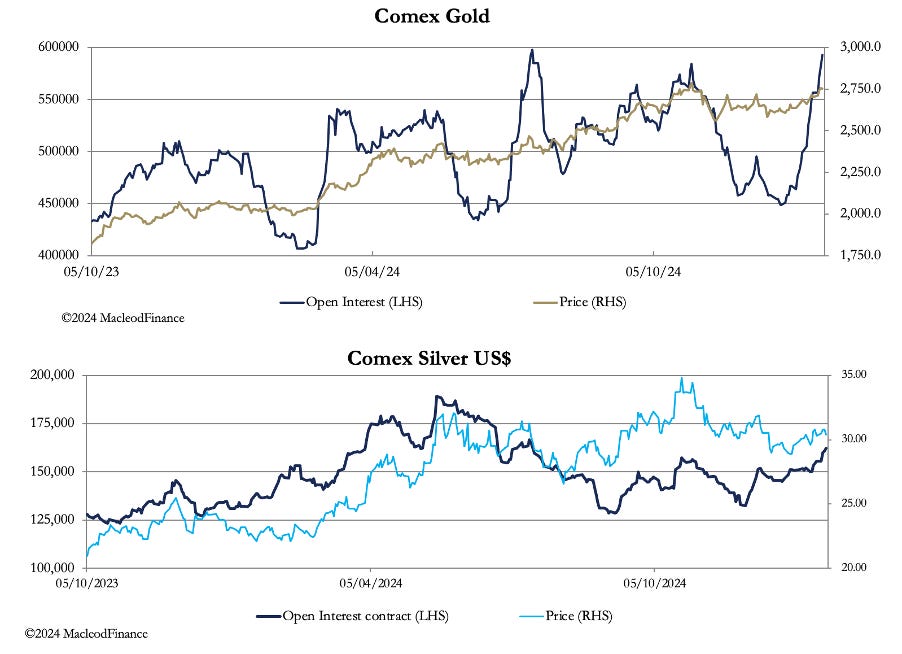 It is worth showing these charts together to demonstrate how gold’s OI has soared, while silver’s increase has been more subdued. The question which we need to address is what has been driving gold and not silver.